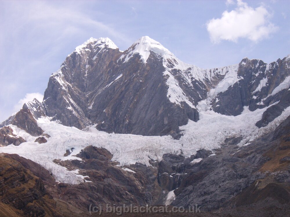 Jirishanca (left), Jirishanca Chico (5445m) just visibleabove crags on the right.