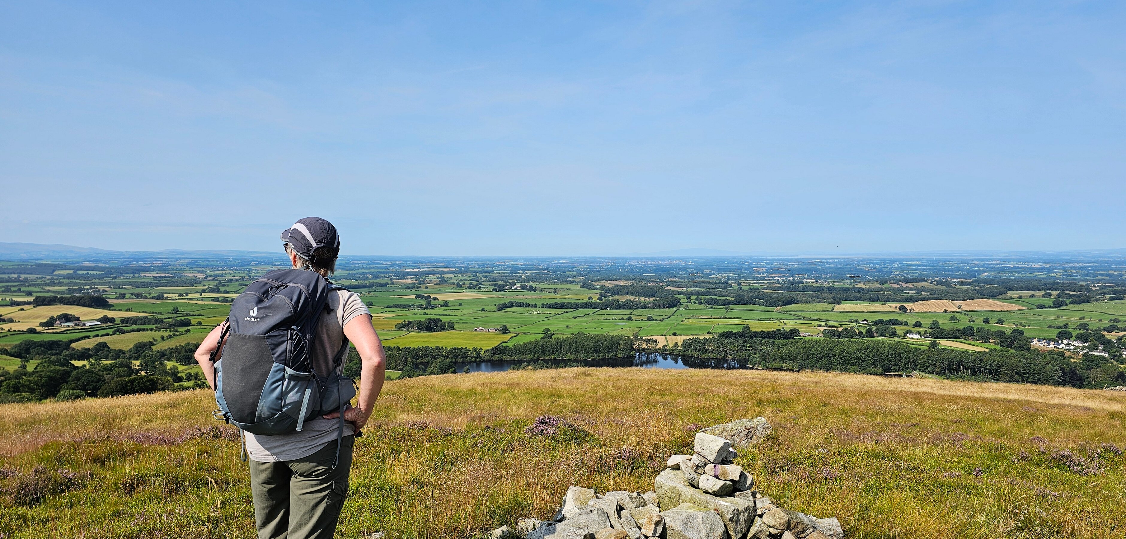 We climbed steadily from the village to Castle Carrock Fell with fantastic views in all directions. The path soon petered out and we were reduced to wading through heather moorland up to a radio mast at Hespeck Raise where we picked up a track along the ridge to a trig point near Cardunneth Pike.